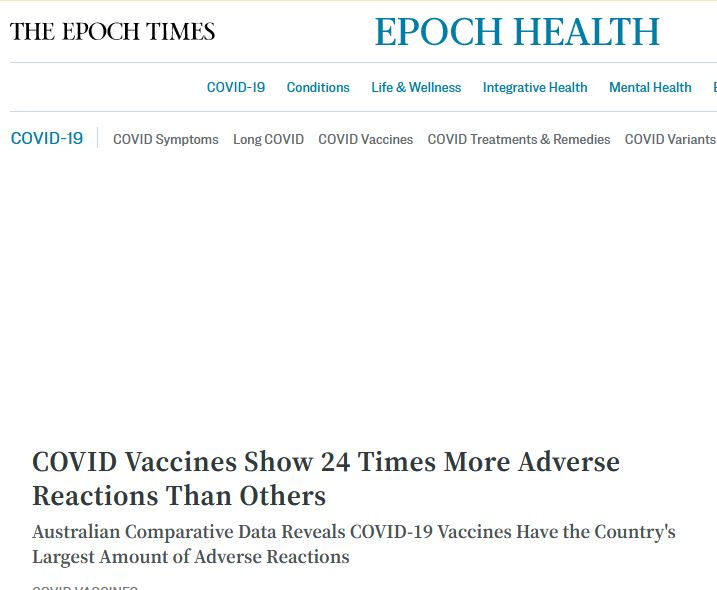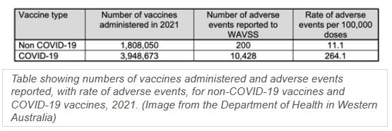 Σύμφωνα με την Έκθεση Παρακολούθησης της Ασφάλειας Εμβολίων της πολιτείας (pdf), και μεταφέρει το The Epoch Times, τα εμβόλια κατά του COVID-19 έδειξαν ότι για κάθε 100.000 χορηγούμενα εμβόλια COVID-19, καταγράφηκαν 264 ανεπιθύμητες ενέργειες μετά από ανοσοποιήσεις (AEFIs).