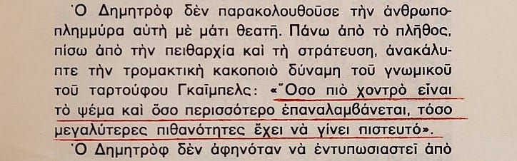 Ο Βλαντιμίρ Τοπεντσάροφ, στο βιβλίο του «Ιδού ο άνθρωπος Δημητρόφ»5 μιλούσε για την τρομακτική κακοποιό δύναμη του γνωμικού του ταρτούφου Γκαίμπελς: