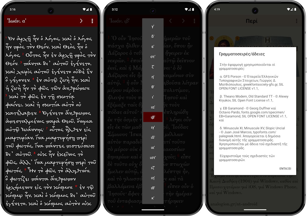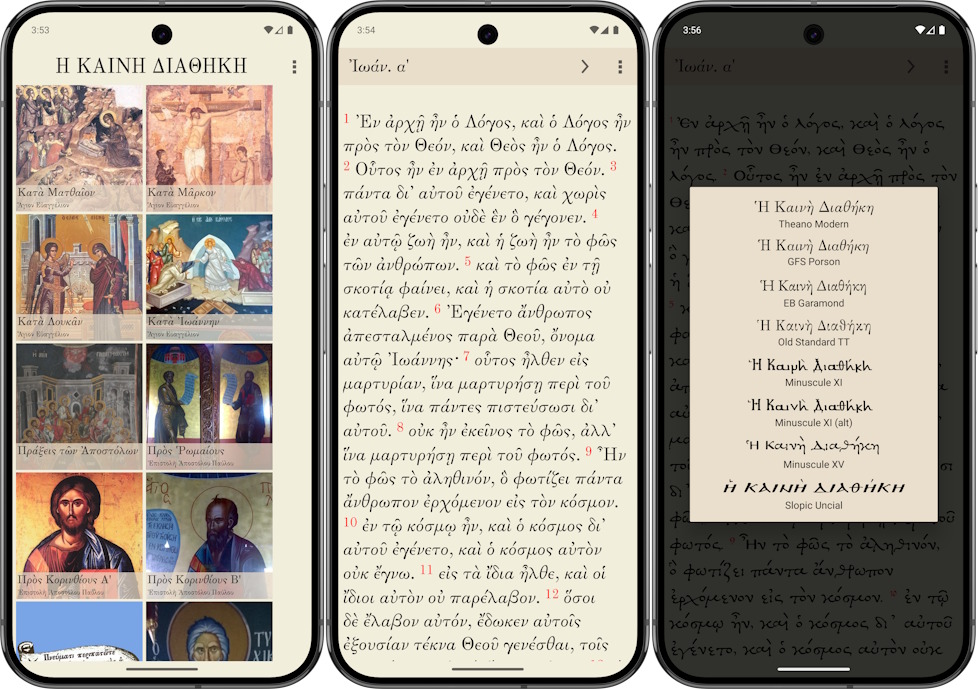 Ἡ ἐφαρμογή Η ΚΑΙΝΗ ΔΙΑΘΗΚΗ σύμφωνη μὲ τὴν ἔκδοση 1904 τοῦ Οἰκουμενικοῦ Πατριαρχείου, γιά Android, προγραμματίστηκε ἀπό τόν Παναγιώτη Δ. Παπαδημητρίου, καὶ εἶναι διαθέσιμη δωρεάν στό Play Store (# gr.psaltiki.nt) ἀπό τό 2014.