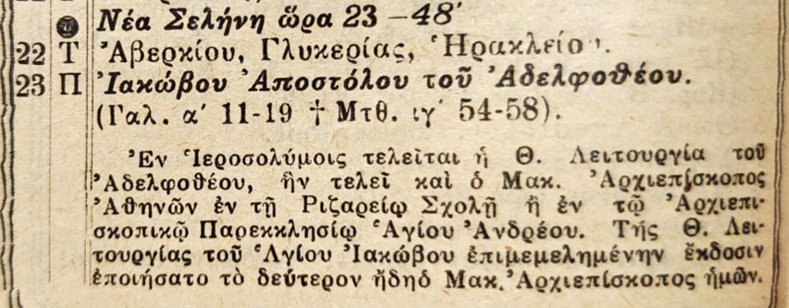 [3] Ἐγκόλπιον Ἐκκλησιαστικόν Ἡμερολόγιον 1930, ἔτ. 7ον, ὑπό Ἐμμ. Ἰ. Φαρλέκα, Γραμματέως τῆς Ἱ. Ἀρχιεπ. Ἀθηνῶν, στίς 23/10.