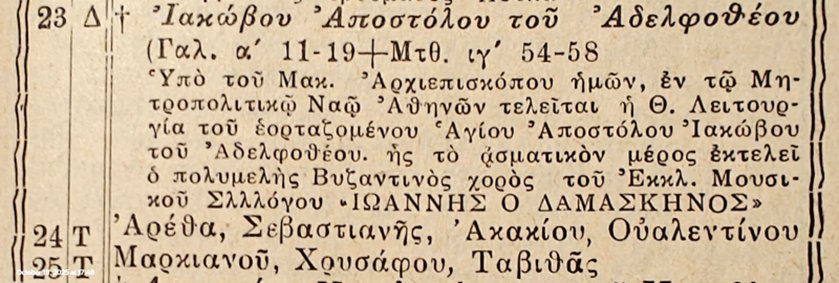 Εἰκ. 2. Ἐγκόλπιον Ἐκκλησιαστικόν Ἡμερολόγιον 1933, ἔτος 10ον, ὑπό Ἐμμ. Ἰ. Φαρλέκα, Γραμματέως τῆς Ἱ. Ἀρχιεπ. Ἀθηνῶν, 23 Ὀκτωβρίου.