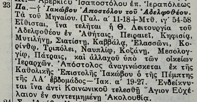1994, 1997: Στίς 23/10 ἀναφέρουν: «ΕΙΔΗΣΙΣ. Εἴθισται, ἵνα τελῆται πολλαχοῦ ἡ Θεία Λειτουργία τοῦ Ἁγ. Ἰακώβου τοῦ Ἀδελφοθέου, ἐνιαχοῦ δὲ ἵνα ἐν τῇ ἡμέρᾳ ταύτῃ τελῆται καὶ Ἅγιον Εὐχέλαιον».