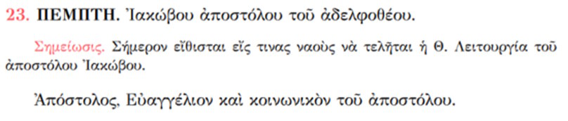 2009-2025, στίς 23/10, οὐδόλως ποιοῦν μνήμη τῆς Λειτουργίας τοῦ Ἰακώβου (οὔτε ὡς προαιρετική Εἴδηση) – θὰ ἔπρεπε ὅμως νὰ τονίζουν ὅτι σύμφωνα μὲ τό ἰσχῦον Τυπικόν (ΤΜΕ), τελεῖται ἡ Λειτουργία τοῦ Χρυσοστόμου, διότι (μετά τὰ τόσα 80 χρόνια διαφημίσεως) συνεχίζουν νὰ τελοῦνται αὐτὲς οἱ Λειτουργίες τοῦ Ἰακώβου (μιὰ ἁπλὴ ἀναζήτηση στό google ἀναδεικνύει τὴν ἔκταση καὶ τὴν κατάσταση τοῦ θέματος).