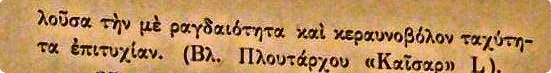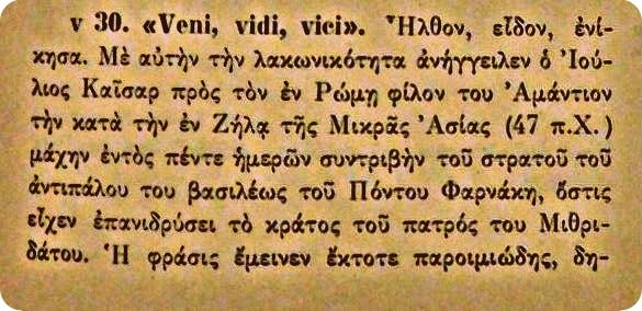 «Ἦλθον, εἶδον, ἐνίκησα. Μὲ αὐτὴν τὴν λακωνικότητα ἀνήγγειλεν ὁ Ἰούλιος Καῖσαρ πρὸς τὸν ἐν Ρώμῃ φίλον του Ἀμάντιον τὴν κατὰ τὴν ἐν Ζήλᾳ τῆς Μικρᾶς Ἀσίας (47 π.Χ.) μάχην ἐντὸς πέντε ἡμερῶν συντριβὴν τοῦ στρατοῦ τοῦ ἀντιπάλου τοῦ βασιλέως τοῦ Πόντου Φαρνάκη, ὅστις εἶχεν ἐπανιδρύσει τὸ κράτος τοῦ πατρός του Μιθριδάτου. Ἡ φράσις ἔμεινεν ἔκτοτε παροιμιώδης, δηλοῦσα τὴν μὲ ραγδαιότητα καὶ κεραυνοβόλον ἐπιτυχία».