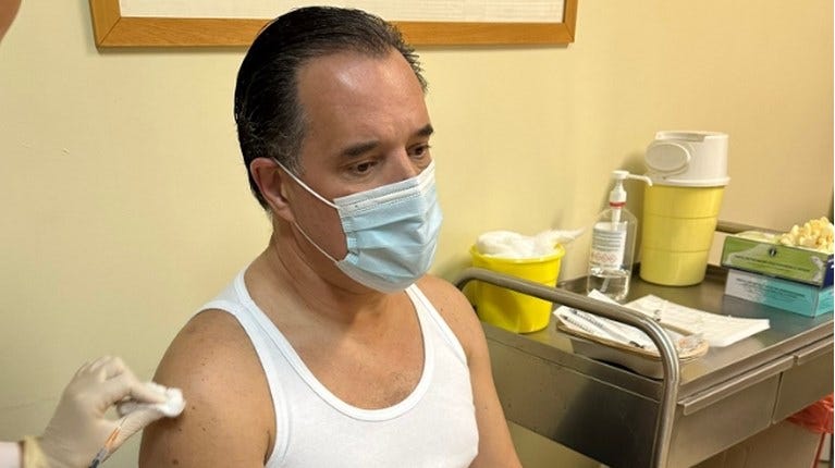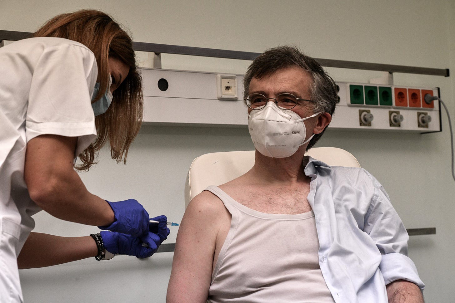 Φυσικά, δεν είχε παραλείψει να φωτογραφηθεί με προπαγανδιστική πρόθεση την στιγμή του εμβολιασμού του, οπότε εμφανίσθηκε με λευκό φανελάκι τύπου Μινέρβα, το οποίο είναι απορίας άξιον πώς ανταποκρίνεται στην αισθητική εκείνης που αποκαλεί «κοριτσάκι» του. Τουλάχιστον, ήταν πεντακάθαρο, σε αντίθεση με το αλήστου μνήμης λιγδωμένο φανελάκι του κ. Τσιόδρα12.