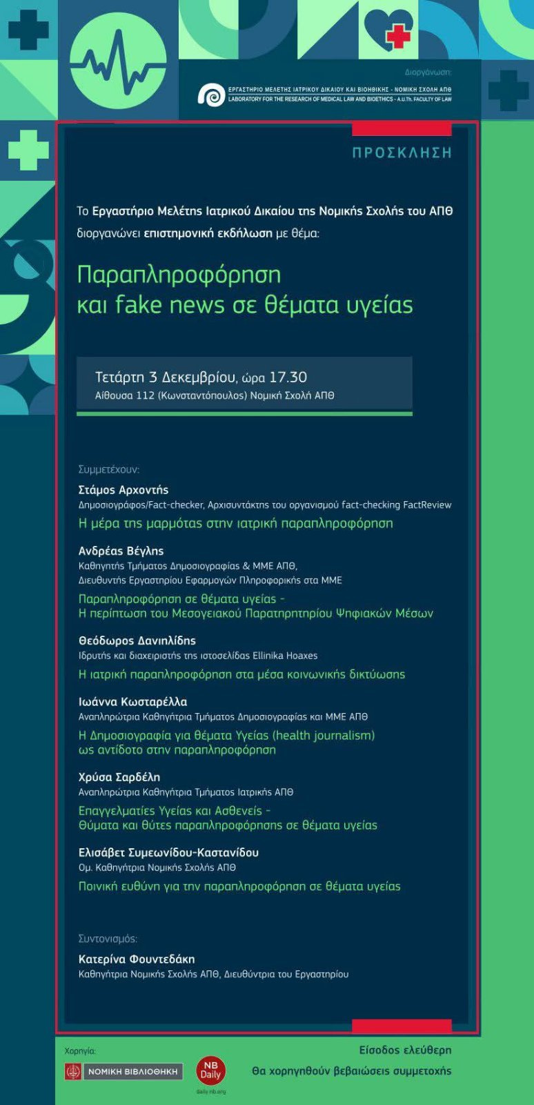 Την Τετάρτη 3 Δεκεμβρίου 2025, το Εργαστήριο Μελέτης Ιατρικού Δικαίου της Νομικής Σχολής του ΑΠΘ διοργανώνει επιστημονική εκδήλωση με θέμα:
