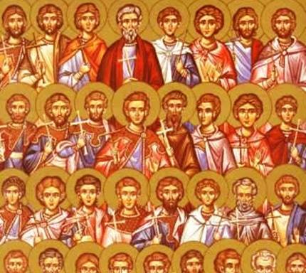 Θείον στράτευμα, πόλις αγία, περιούσιος λαός Κυρίου, ανεδείχθητε δισμύριοι Μάρτυρες, τη γαρ αγάπη αυτού δροσιζόμενοι, δια πυρός τον αγώνα ηνύσατε. Αλλ’ αιτήσασθε, ελέους σοφοί τον πρύτανιν, δωρήσασθαι ημίν το μέγα έλεος.